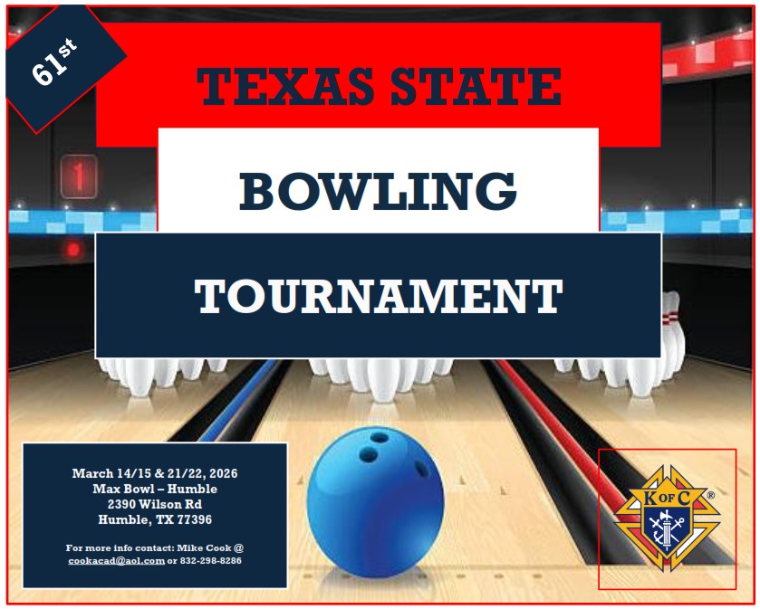 If you would like to join us and receive an entry form for our 2026 Knights of Columbus State Bowling Tournament, or just want more information, please contact Mike Cook at 832-298-8286 or email cookacad@aol.com. The deadline to enter the KC tournament is Feb. 20, 2026.